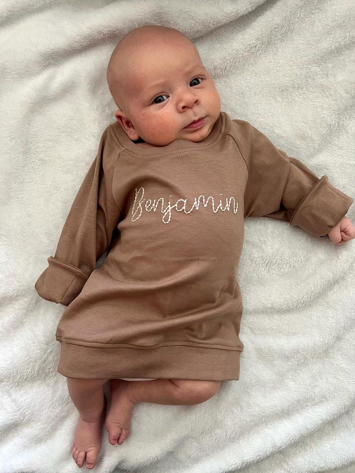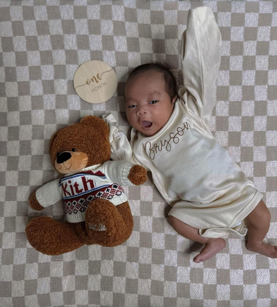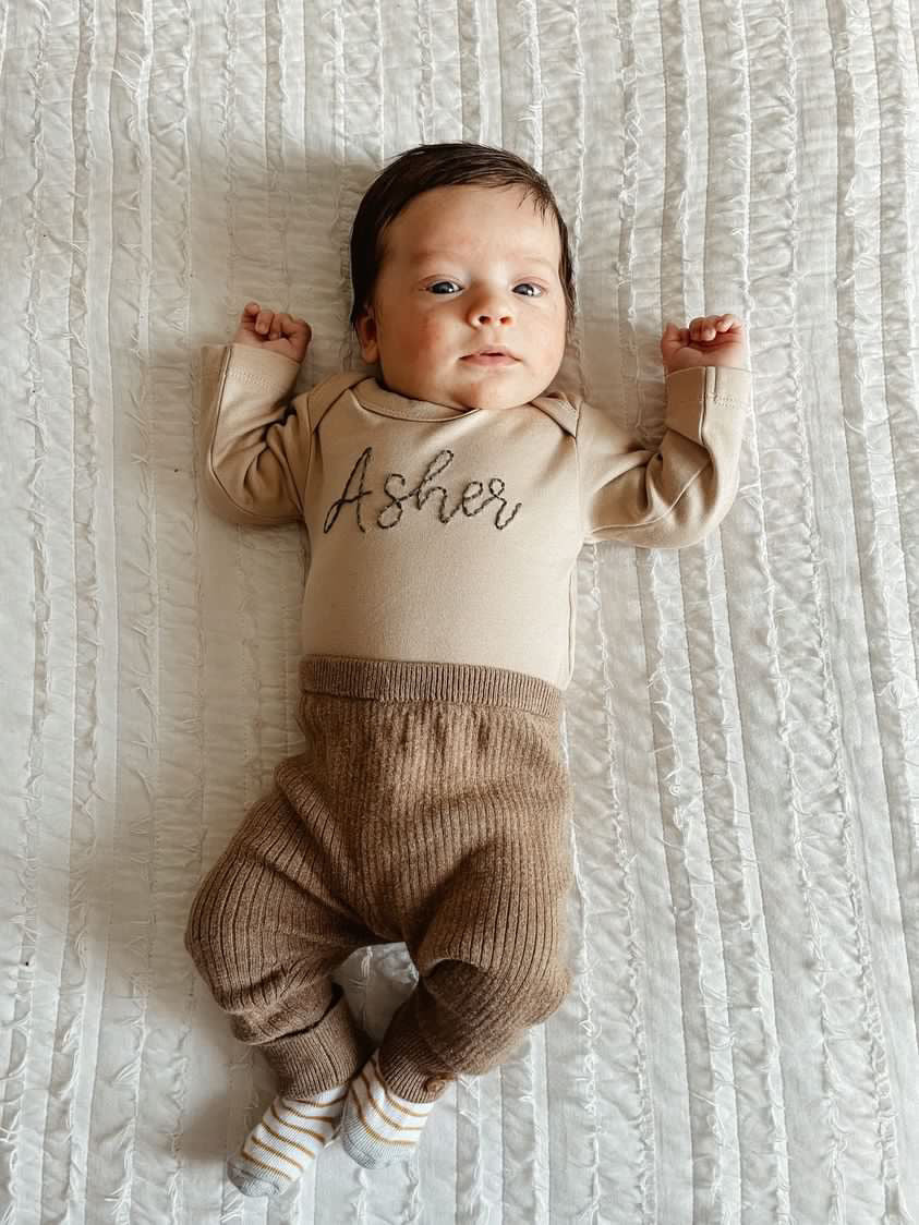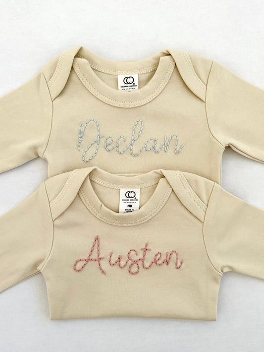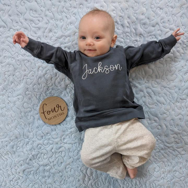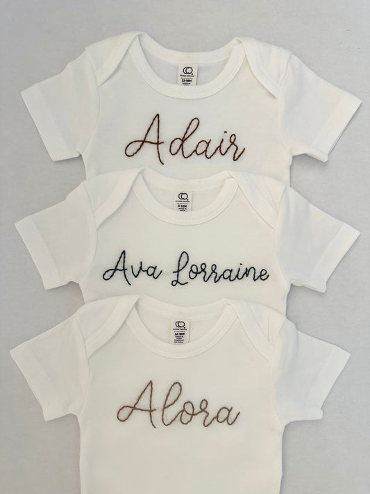 Here you will find custom hand embroidered baby goods that are perfect for gifts, monthly milestone pictures, birth or pregnancy announcements, or just to make your baby look even more adorable!